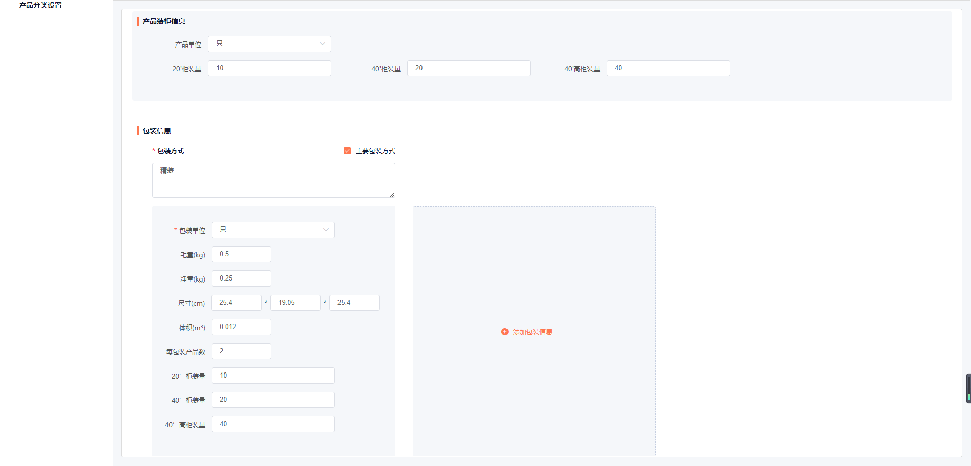 录入必填字段:产品编号、产品类别、中文品名、英文品名、退税率、包装方式、包装单位及基本信息。